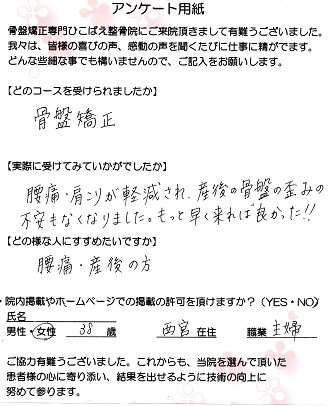 腰痛・肩こりが軽減され、産後の骨盤の歪みの不安もなくなりました。