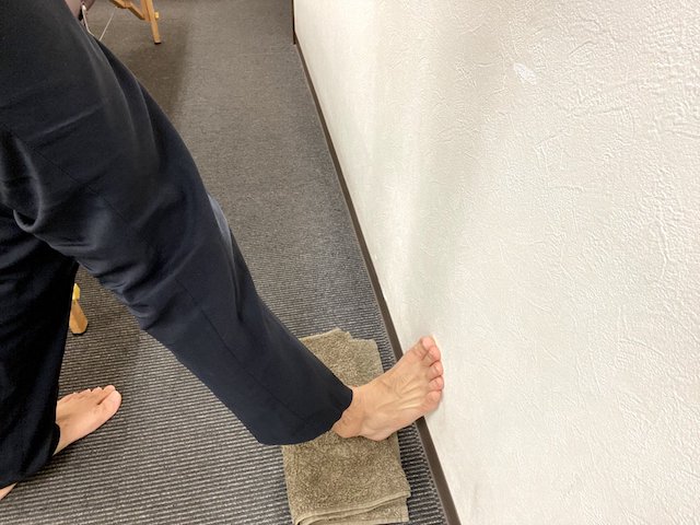 下の写真のように壁に立っていただきかかとの部分にタオルを1枚敷くようにしましょう。